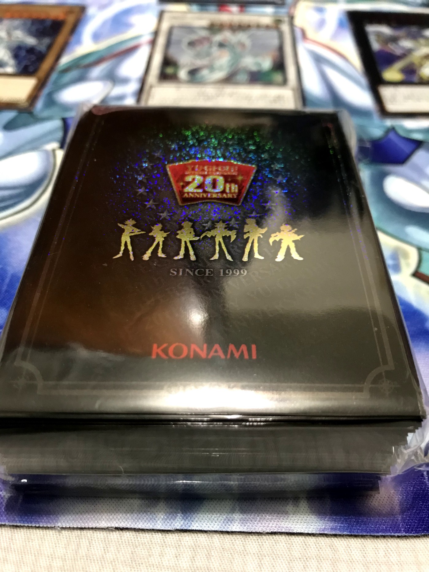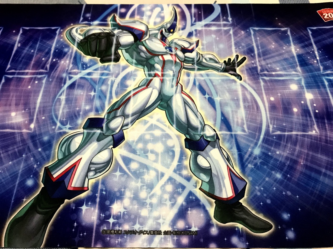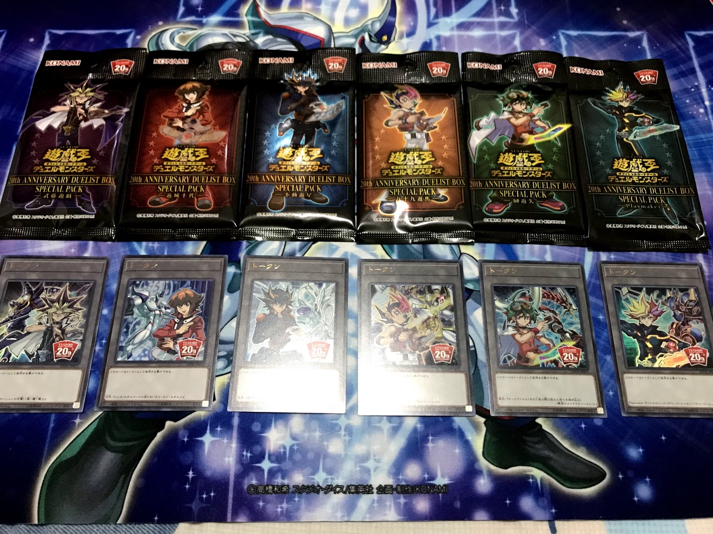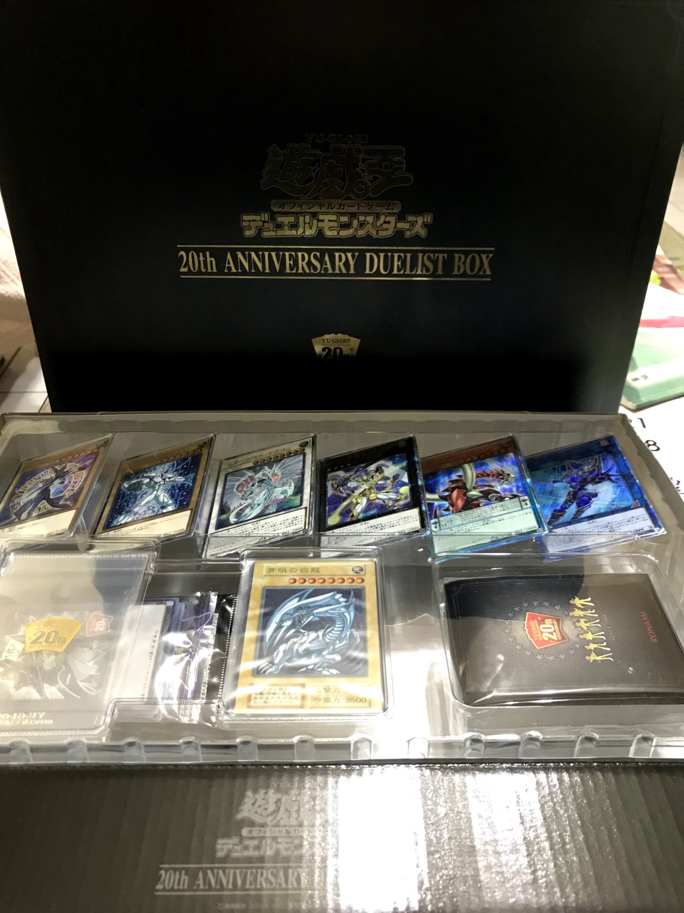 20週年版名片套x1、這次的重點 —(幸運的抽到了)不鏽鋼的青眼白龍與20週年卡套x100 - 下排,隨機主角牌墊 x1