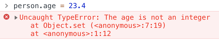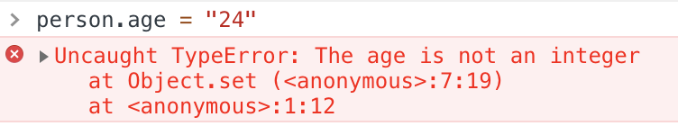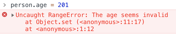 上面的這段的結果,會讓  person  變為一個  Proxy  物件,並且在給值前進行檢查,如果給值的對象是 age , 則給的值 必須是不大於 200 的整數 ,否則會賦值失敗。