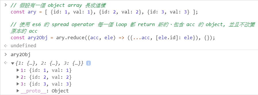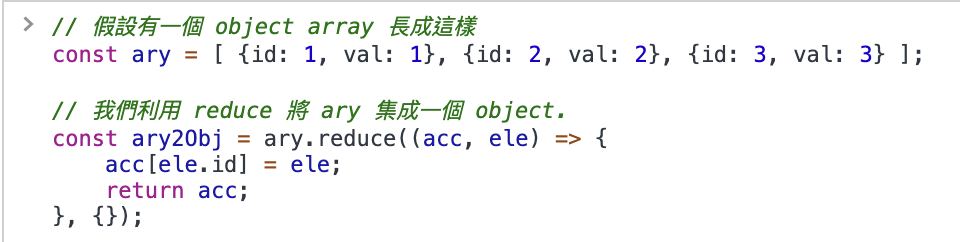這邊我們使用  reduce  來將  ary  中的元素集成起來,並且輸出為一個 object。