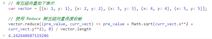 我們想計算出這五組向量的平均長度 ,則可以使用 Reduce 完成。