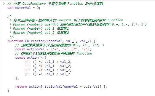 因此在這邊,此 Function 的「正確作法」是我們應該將  outerVal  也作為參數傳入,以顯式地表達此 Function 與  outerVal  也有關係 (FP 有一種叫做 Currying 的方法可以解決此問題,我們之後會講解)。