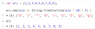 此作法會得到一個新的 Array  [“A”, “}”, “¹”, “õ”, “ı”, “ŭ”, “Ʃ”, “ǥ”, “ȡ”]  並且,原始 Array  ary  的內容並沒有因此被更動。