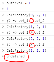 我們假設有一個做「加減乘除工廠函數 (factory function) 」,因為某些原因,產生新的 function 時需要依靠一個 global 變數  outerVal  才能決定應該要產生哪個 function。那麼,這就 不是 一個 Pure function。