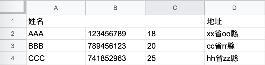 ['AAA', 123456789, 18, 'xx省oo縣'],