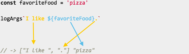 標籤函數的 第一個參數是一「字串陣列」 , 其餘參數則是「處理過的表達式」 。最終,你可以返回一個經處理後的字串,甚至是完全不一樣的東西。