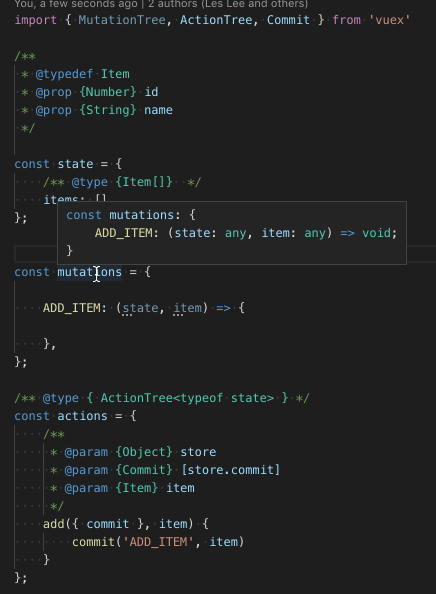 Vuex 本身提供了諸如 MutationTree , ActionTree … 這類的 Interface ,使得我們可以利用 jsDoc 在 mutations , actions 進行註解。好讓 Vscode 得以解析變數的類型。
