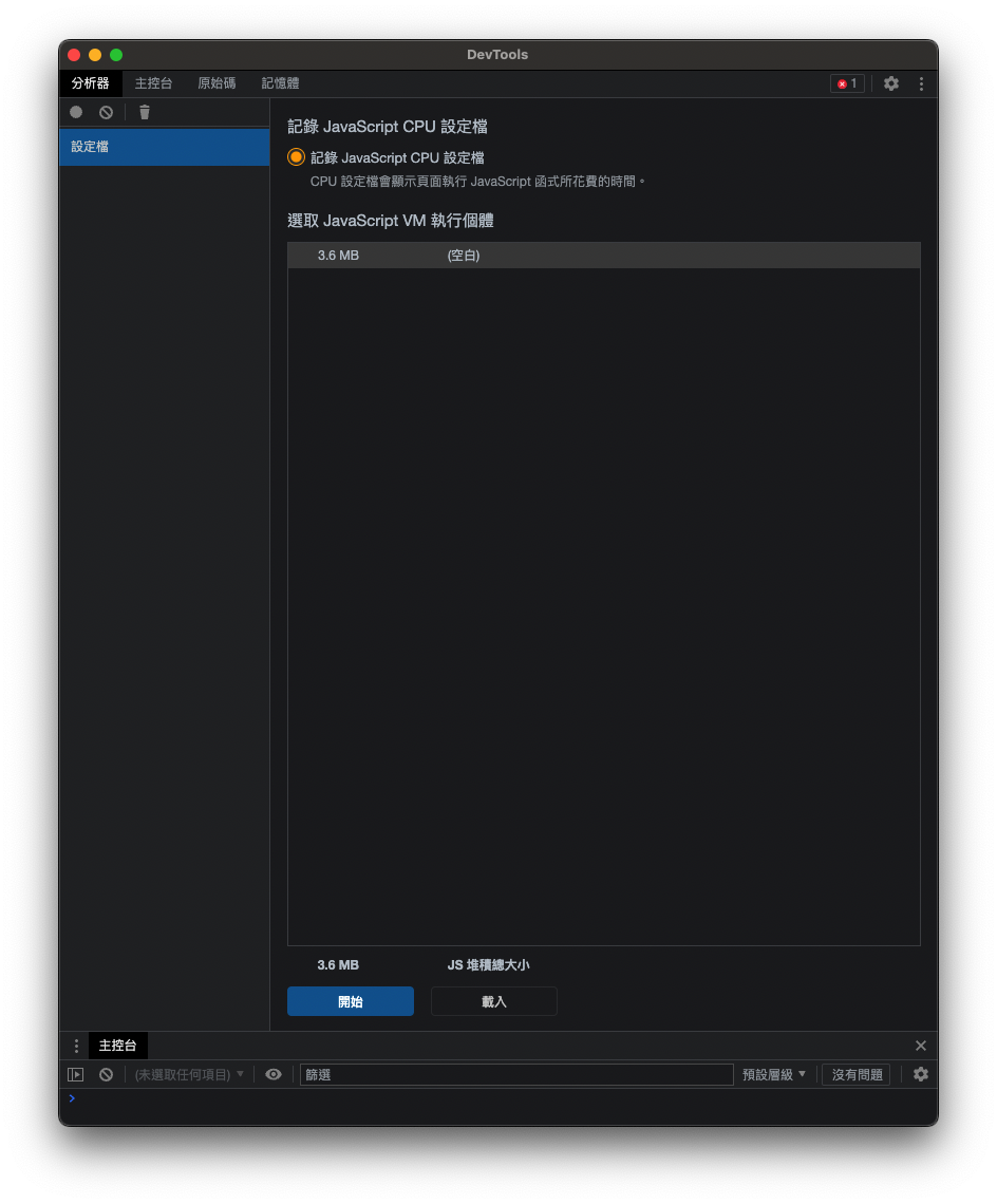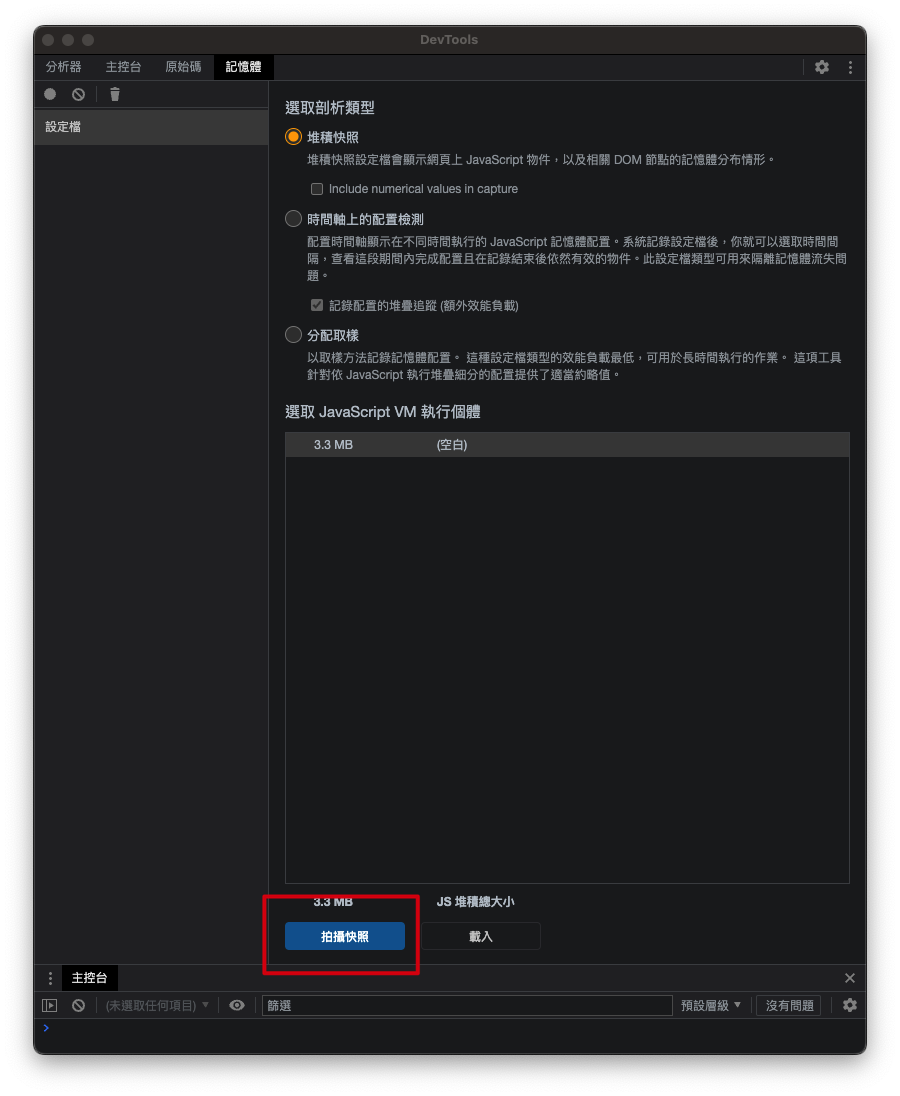 接下來點到 「記憶體」的選項,我們可以錄製記憶體的快照。