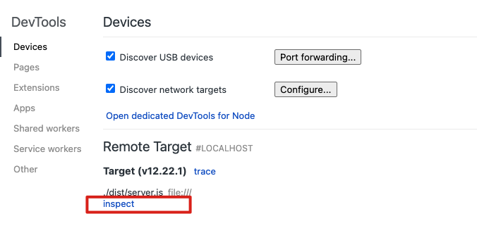 如果 prot 9229 已經開啟且被監聽,chrome 會自動找到相對應的 app 。之後我們可以點擊 inspect 進入監控畫面。