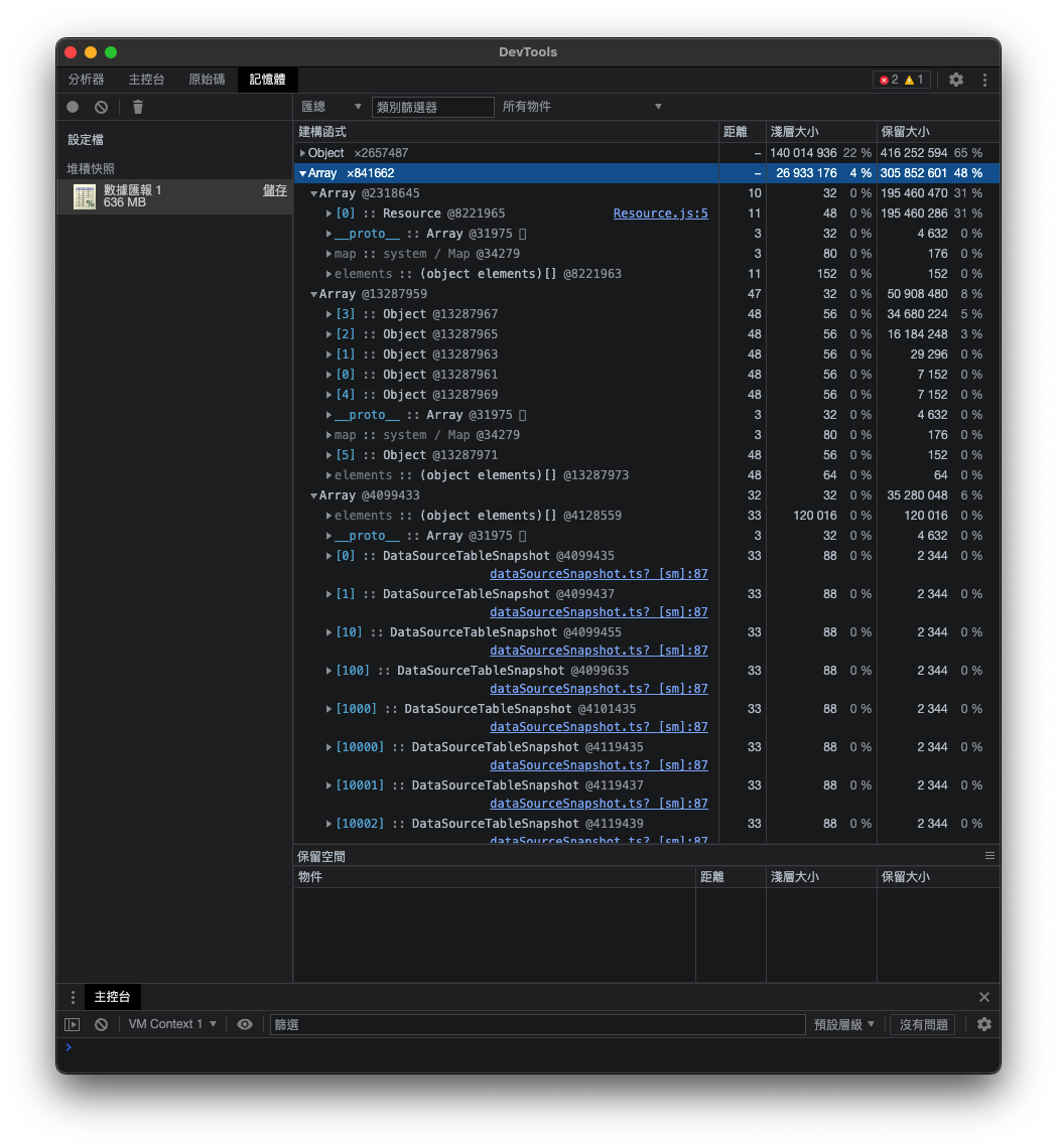 DevTools 會分析出 app 中各個變數結構的使用大小、對比 root 的深度、物件本身佔用的記憶體總量… 等等,一目瞭然。甚至連變數名稱都列出來給你了。