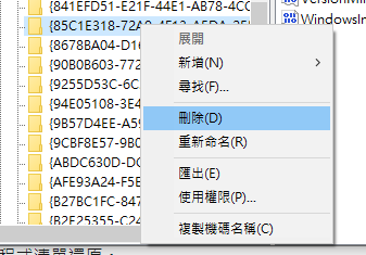 找到要移除的機碼之後,對他「滑鼠按右鍵 -> 刪除」