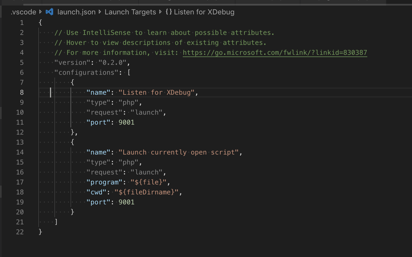 預設應該會長這樣,一般情況這樣就設定完成了,但是由於我們需要讓 XDebug 知道我們要在哪裡 Debug,因此我們在其中多增加一段設定 —  “pathMappings”: {}