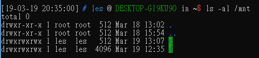 以我自己的 Windows 為例,由於我的 Windows 有  C:\  與  D:\  兩個磁區,因此在 Linux 中我可以使用  /mnt/c  或  /mnt/d  獲取  C:\  或  D:\  的資源。