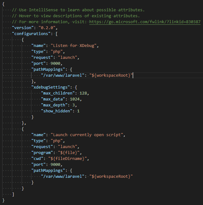 注意到 pathMappings , /var/www/laravel 是 docker 中的路徑,要映射到你的專案 ${workspaceRoot} 。