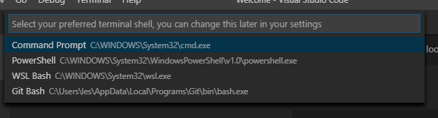 其中 Command Prompt 是我們熟知的 命令提示字元、PowerShell 就是 Windows 之後新出的 Shell 工具、接下來就是 WSL Bash 了。