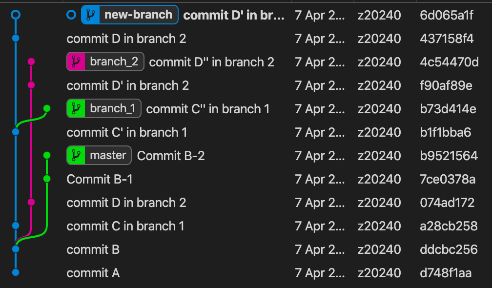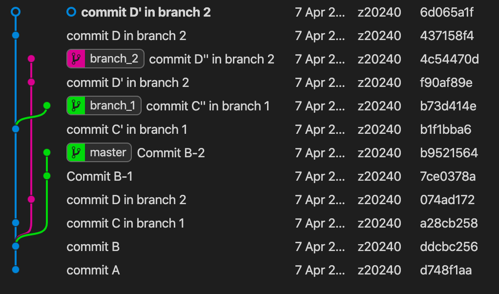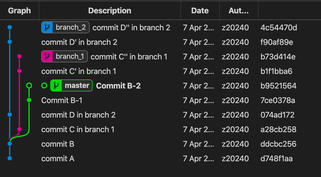 例如:以上面 git history graph 為例,若 我在 branch_1 使用 git rebase branch_2 ,則 會以 branch_2 作為基準,將 branch_1 接在 branch_2 上方 。